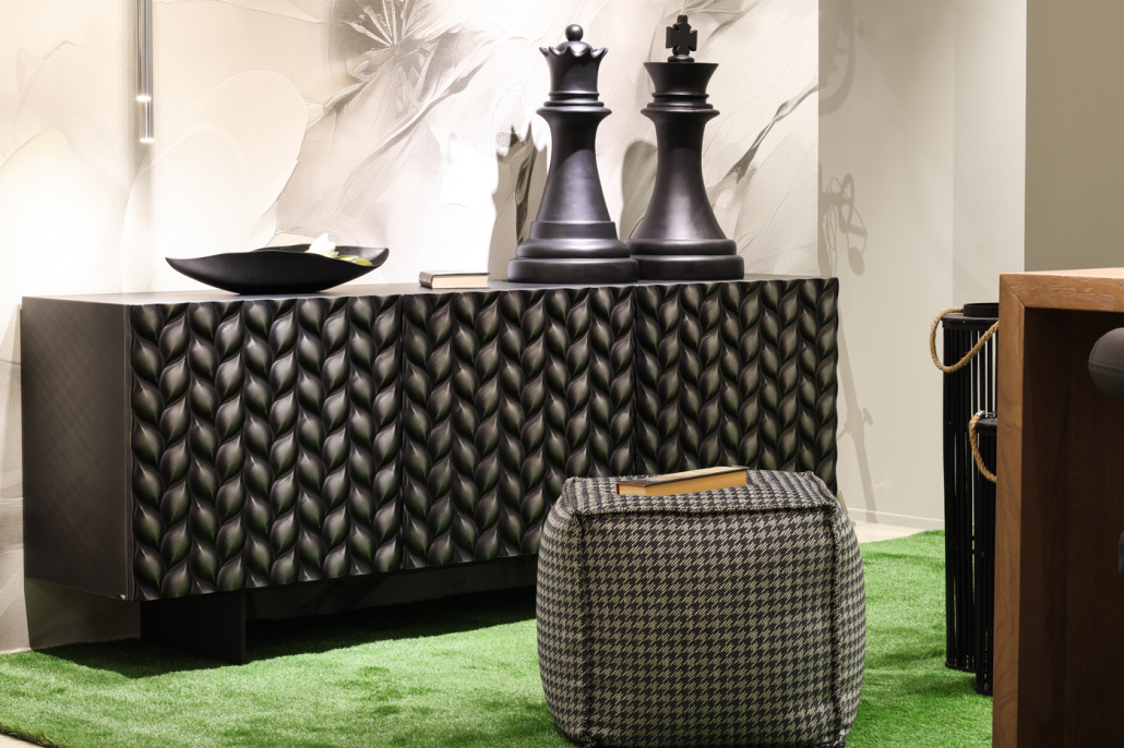 A completare l’ambientazione, una parete in legno cannettato dialoga con una madia dal design elegante. La scelta di una carta da parati dalle texture morbide aggiunge carattere e raffinatezza, rendendo l’insieme equilibrato e mai banale.