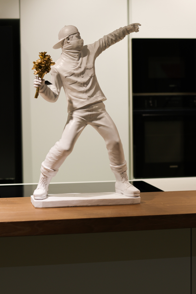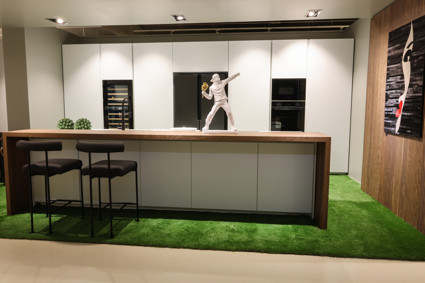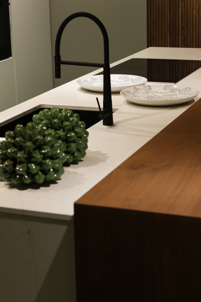 L’estetica è quella di una cucina total white, progettata per un ambiente open space moderno e luminoso. Il piano in quarzo garantisce resistenza e praticità nell’uso quotidiano, mentre il bancone in legno introduce un elemento caldo e accogliente, perfetto per pranzi veloci o aperitivi in compagnia.